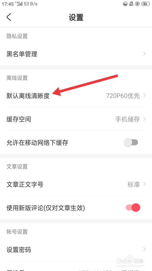 进入到设置界面后,再点击默认离线清晰度选项。