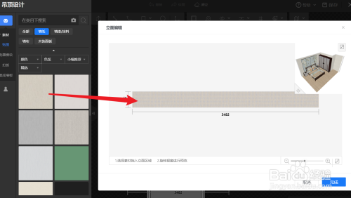 然后选择一个壁纸拖放到面上。点击完成退出,保存修改结果退出吊顶设计。