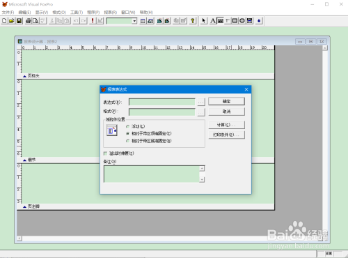 6在“报表设计器”的相应带区拖出一个矩形框,在随后弹出的“报表表达式”对话框