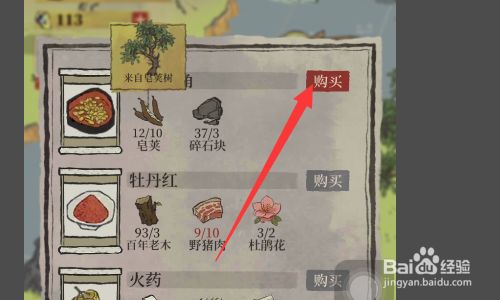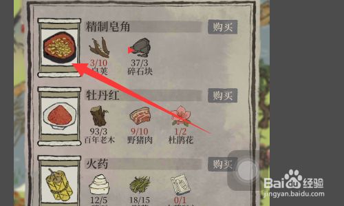 然后我们在地图上去凑齐皂荚和碎石块,我们点击其右侧的购买即可获得精致皂角