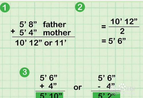 简化的格雷预测法需要把你父母的身高加起来,除以2,男孩在平均数的基础上加10厘米,而女孩则减10厘米。