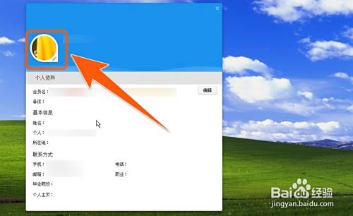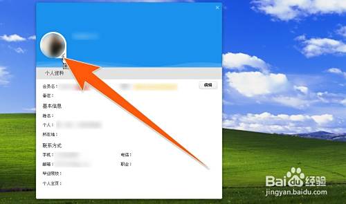 点击弹出的旺旺头像后,就会打开一个旺旺个人信息编辑窗口,在编辑窗口上面的旺旺头像旁,有一个笔状的图标,用来提示修改旺旺头像就点此处,那再点击这个旺旺头像。