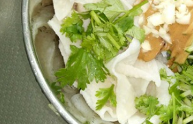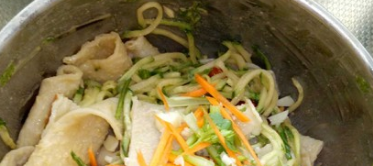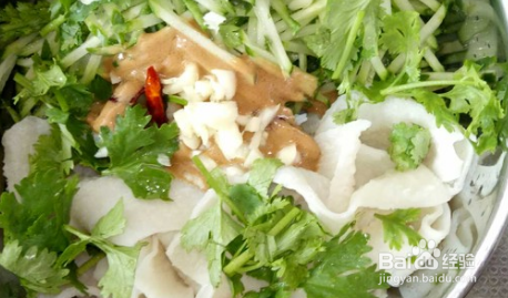 黄瓜胡萝卜切丝香菜切段蒜拍碎,倒入麻汁拌匀