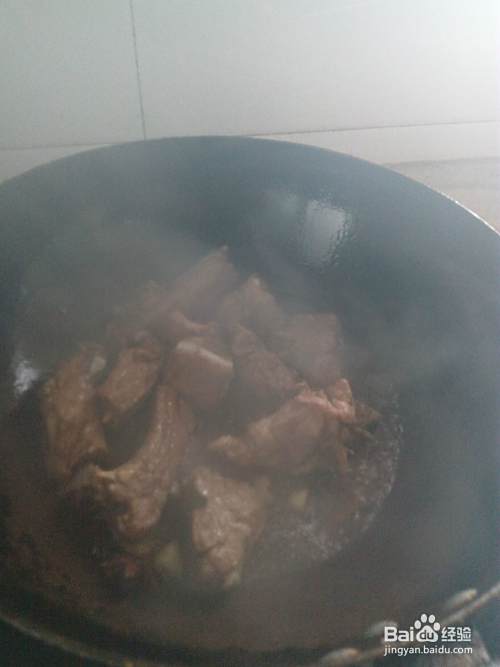 放油 油好了放姜,大蒜和酱油 放排骨 爆炒大概十多分钟