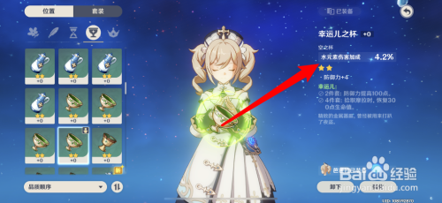 7、接着给芭芭拉装备水元素伤害加成的圣遗物