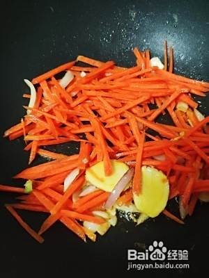 葱姜蒜爆香,倒入胡萝卜翻炒,多炒一会。