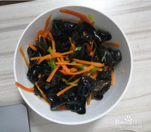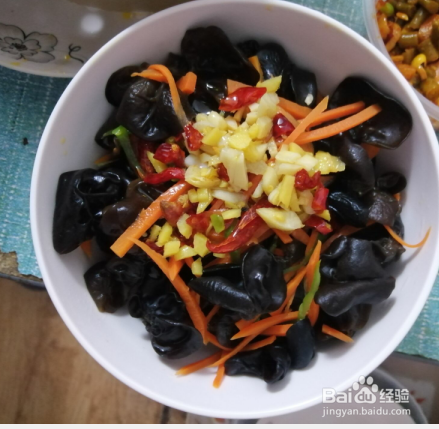 木耳用温盐水泡发半小时,洗用清水洗干净备用;
