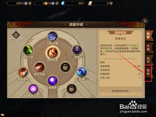 进入到【技能升级】页面后,在页面右下角玩家会看到有个【转职】按键,接着点击此按键。