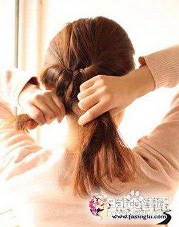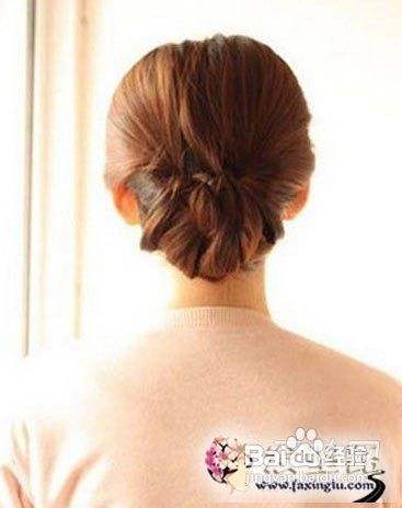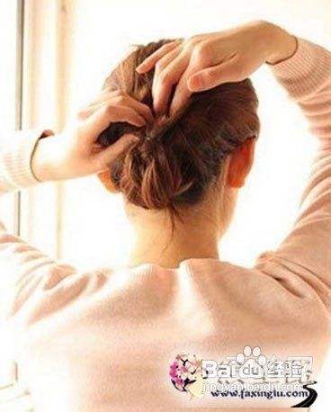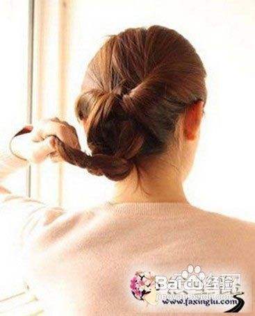六:把头发编成简单的麻花辫之后,用皮筋固定好发尾,再把发辫由内向上卷起。
