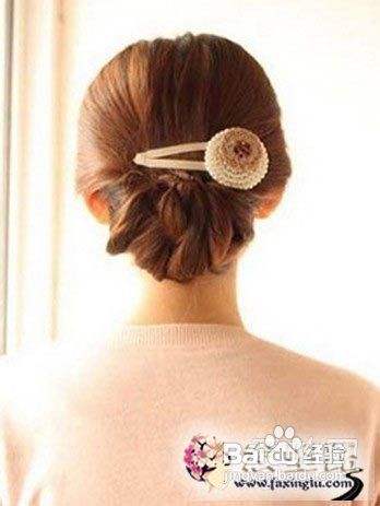 七:就这样如图所示卷到之前挖好的小洞里面,再用小发卡夹好掉落的发丝,迷人的编发盘发就盘好了。