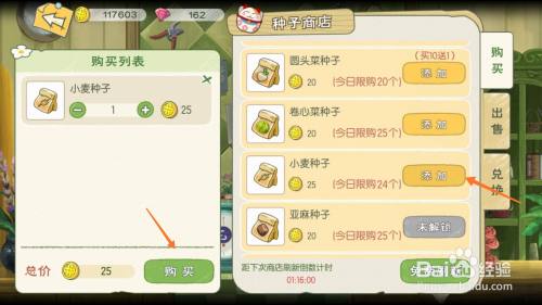 在打开的种子店中,添加红薯种子,在左侧的购买清单中,支付25金币,点击购买即可。