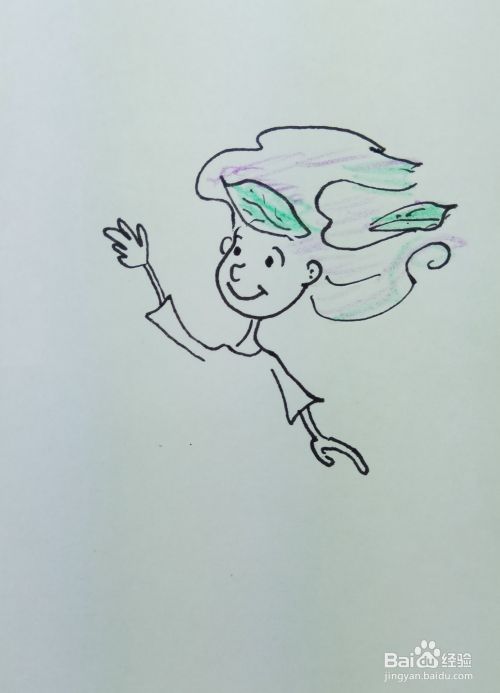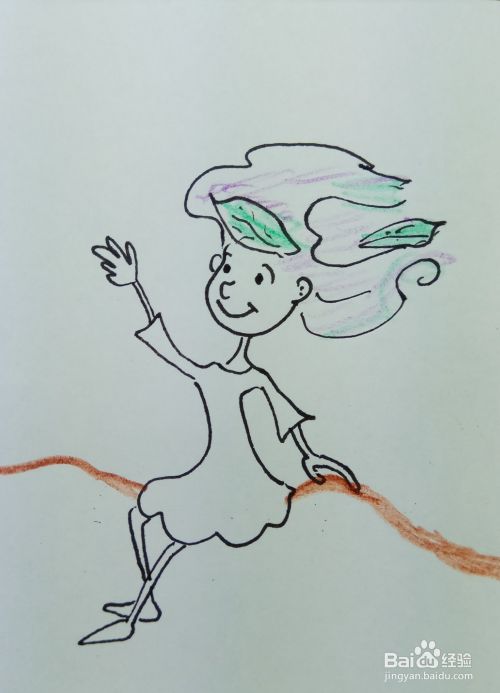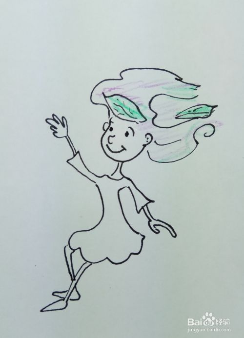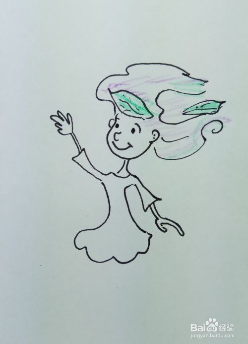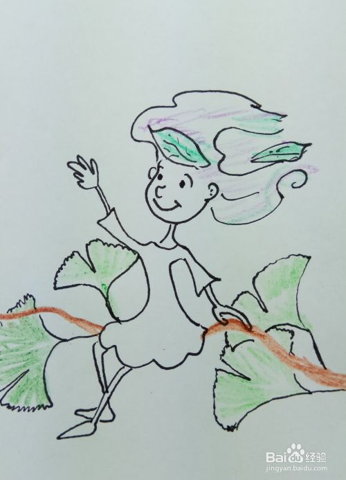 用水彩笔涂出小精灵身上穿着的衣服色彩,修饰一下细节,漂亮的简笔画银杏树小精灵就画好了。