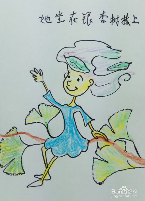 画出一个银杏树枝的外形轮廓,并画出银杏树叶的样子,涂上色彩,小精灵正在银杏树枝上休息呢。