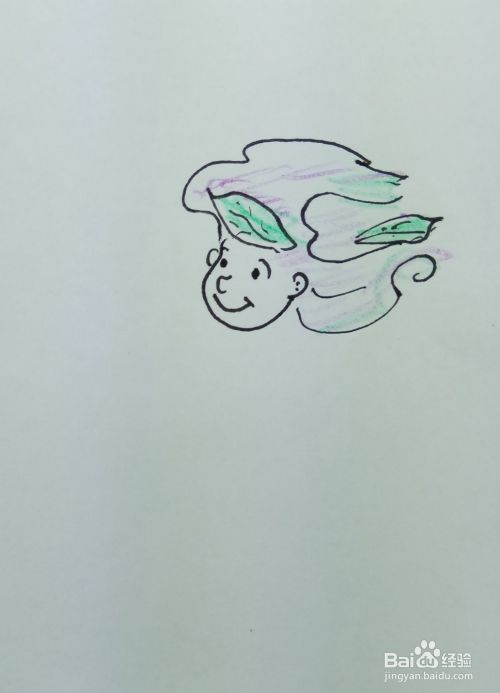在白纸上用线条和曲线画出银杏树小精灵的头部轮廓,并画出她的五官和头发部分,再涂出她的头发色彩。