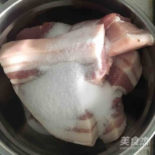 1五花肉洗完,切成适当的长度(切不切随自己喜好,我主要是方便后面吃),用厨房纸吸干水分,把五花肉放入大盆,把盐全部倒入,慢慢揉搓约两三分钟左右,使每块肉都均匀的覆盖一层薄盐,尽量揉搓到盐都吃进肉里面,盖上保鲜膜,腌制一个小时左右!