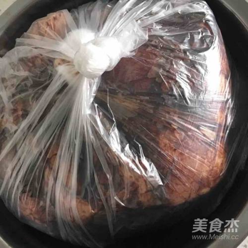 5把整袋放在盆里面,放冰箱冷藏,每一天给袋子翻下,保证肉的每个地方浸泡的差不多,一般腌制4-7天左右都可以!