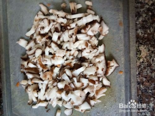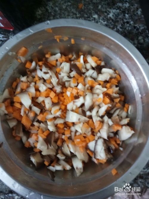 将胡萝卜丁和香菇放在一起,放入盐后搅拌均匀