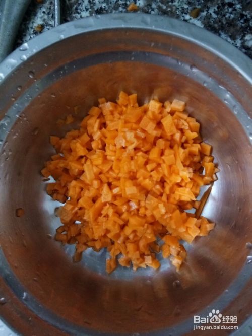 胡萝卜去皮后洗净,切成丁,放在盘里备用