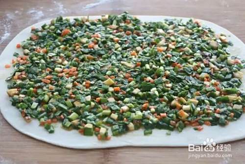 将韭菜馅平铺一层在薄饼上,然后对折四周捏一下防止馅外漏。