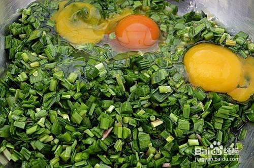 韭菜切成末状,然后打几个鸡蛋。鸡蛋数量和你喜欢吃的程度有关,至少放两个。