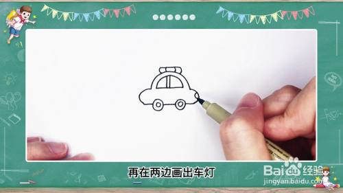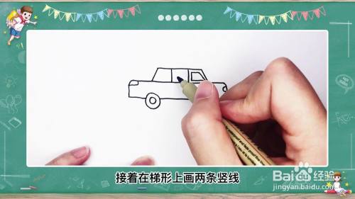 然后在车头和车尾画上车灯,接着在梯形上画两条竖线,再把中间画上方块,这是汽车的玻璃。