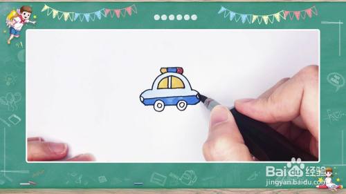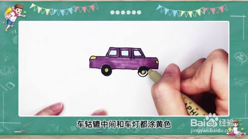 最后给汽车的玻璃涂蓝色,车轱辘中间和车灯都涂黄色。用棕色涂车身,车轱辘涂上黑色。这样一个时尚的小汽车就画好了。