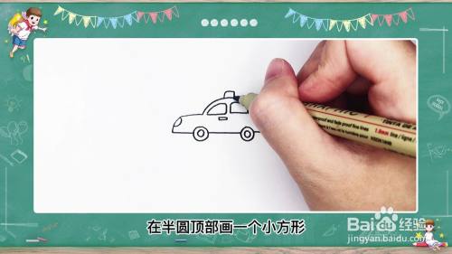 首先画一个半圆形不堵口,然后再画一个封口的半圆形。接着在这个小半圆形里画两条竖线,这是小汽车的窗户。然后在半圆顶上画一个椭圆的小长条,中间画两条弧线。在连接半圆画两个弧线。