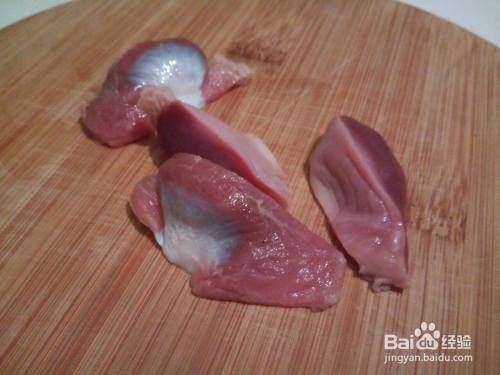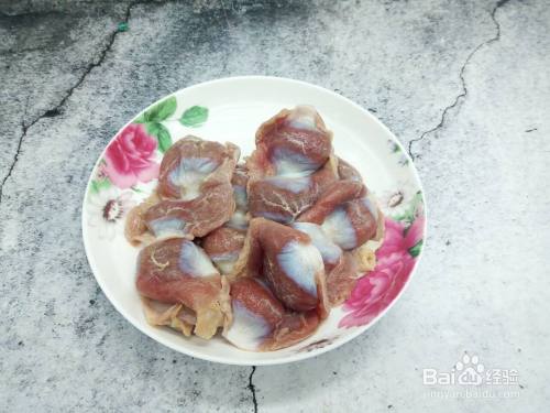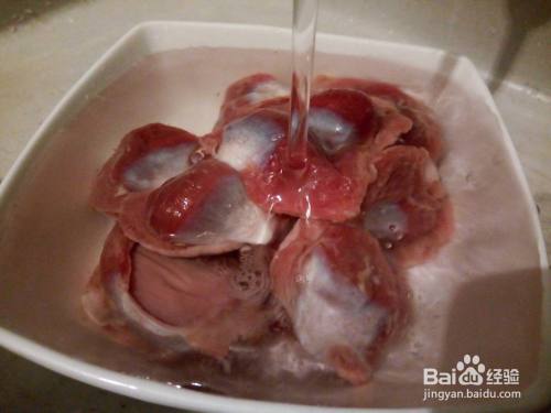 洗干净的鸡胗撒上盐,用盐洗搓过的鸡胗再用清水冲洗干净