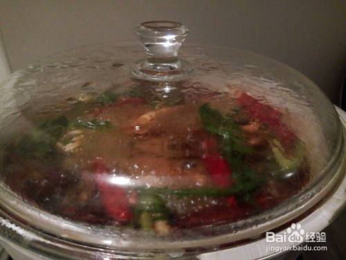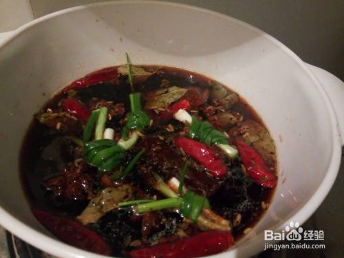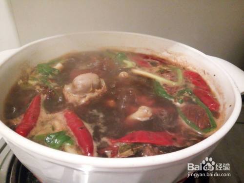 炒好的调料倒入炖锅,加适量清水,烧开,放几个葱结