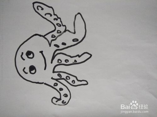 第八步、眼珠涂上黑色,画出它微笑着的嘴巴,小圆球来表示周围的气泡。这样章鱼就画好了。