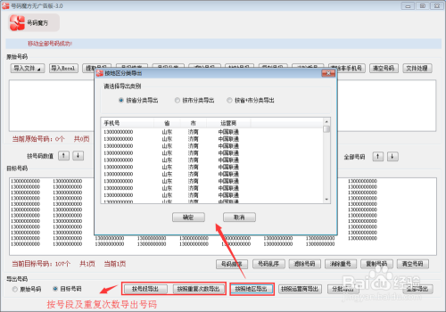 (3)、按照地区导出:将目标号码按照号码归属地导出号码