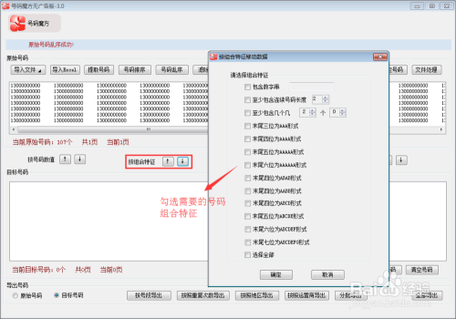 点击图中”按组合特征“中的” ↓“符号,在弹框中勾选需要的组合特征,点击”确定“按钮,可对导入的原始号码进行筛选,将原始号码中符号条件的号码生成目标号码。