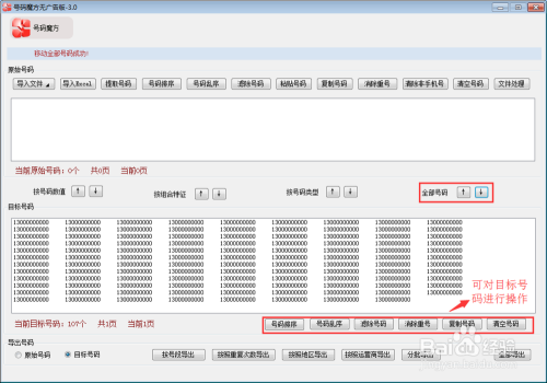 若原始号码即为所需的目标号码,可点击图中”全部号码“中的” ↓“符号,可将原始号码移动至目标号码框,将全部原始号码生成目标号码。生成目标号码后,点击对应的按钮,可对目标号码进行”号码排序“、”号码乱序“、”消除重号“、”复制号码“等一系列操作。