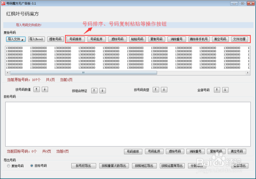 导入号码后即生成原始号码,点击对应的按钮,可对导入的原始号码进行“号码排序”、“号码乱序”、“滤除号码”、“粘贴号码”、“消除重号”等系列操作。