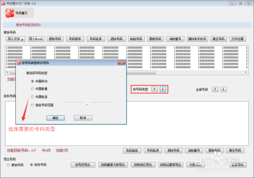 点击图中”按号码类型“中的” ↓“符号,在弹框勾选所需的号码类型,点击”确定“按钮,可对原始号码进行筛选,将原始号码中符号条件的号码生成目标号码。