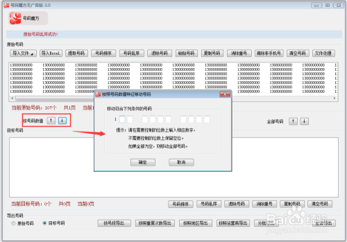 点击图中”按号码数值“中的” ↓“符号,在弹框中输入需要控制的位数的数字,点击”确定“按钮,可对导入的原始号码进行筛选,将原始号码中符号条件的号码生成目标号码。