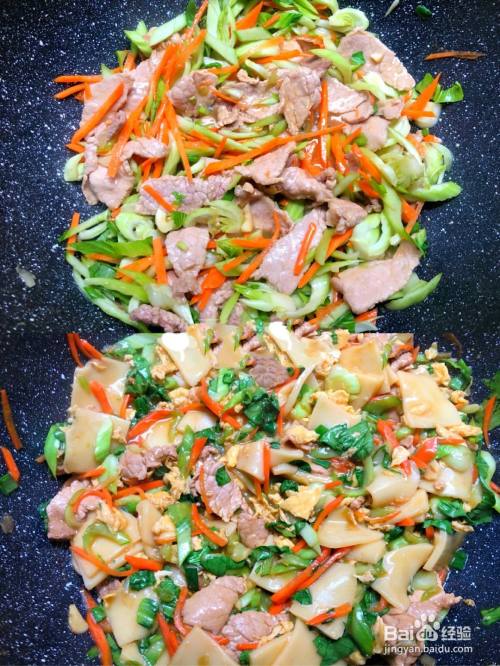 锅里放入适量油烧热,把蒜末和葱白放入爆香,再把瘦肉放入炒熟,加入青菜梗和胡萝卜翻炒一下,加入适量盐翻炒至入味。