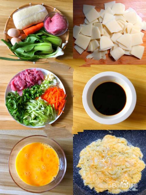 瘦肉清洗干净切薄片,胡萝卜去皮切丝,上海青洗净切碎,葱洗净切葱花,蒜头去皮切蒜末,年糕切成薄片,鸡蛋打成蛋液待用。