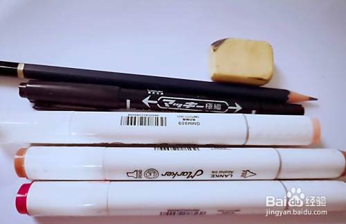 第一步,准备好我们要用到的材料:一支铅笔、一块橡皮、一支勾线笔(含有粗细两头)、一些马克笔和一张白纸。