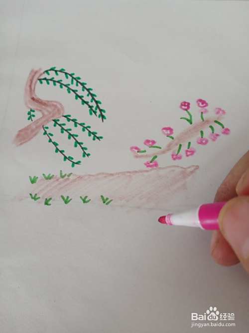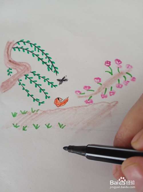 再画出飞翔的燕子,和沙子旁边的鸳鸯。