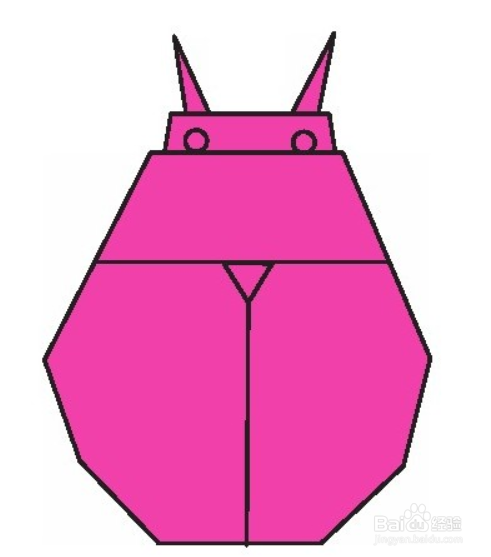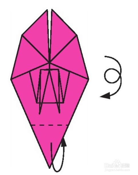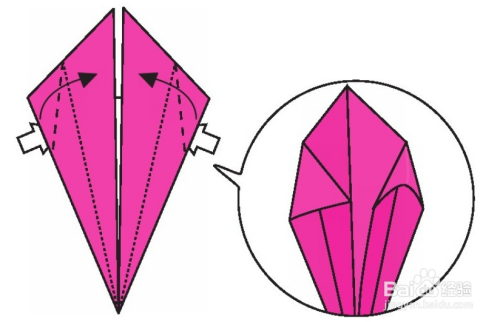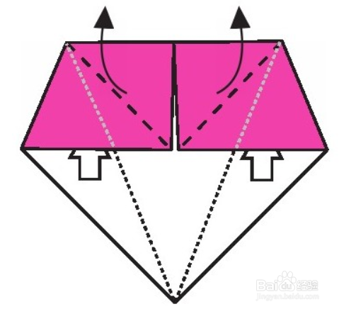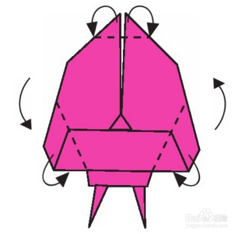 沿虚线折出痕迹,然后按图示撑开左右两边,并向箭头方向拉折