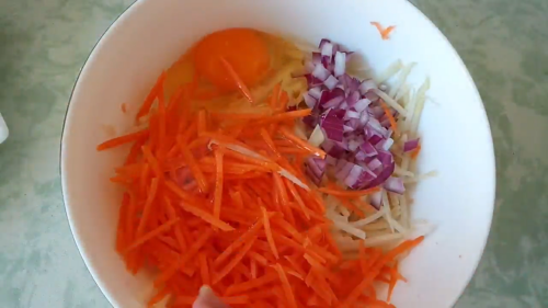 胡萝卜、土豆、洋葱装碗打入一个鸡蛋。