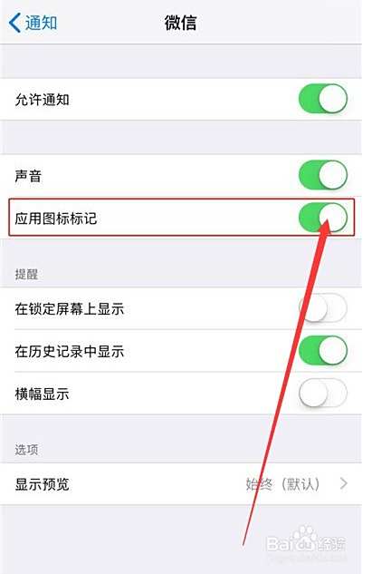 点击第三项【应用图标标记】右边的按钮,关闭即可。这样微信应用上就不会有数字提示了,其他的应用也可以这样设置。