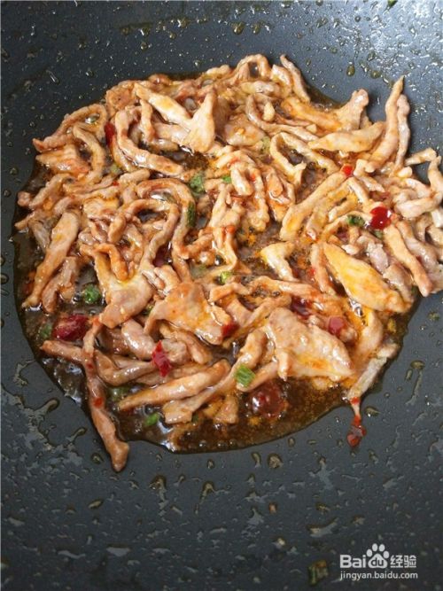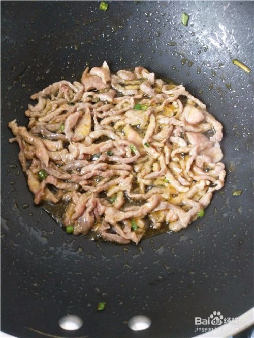 倒入肉丝,大火翻炒均匀,再调入适量的郫县豆瓣酱,翻炒均匀。