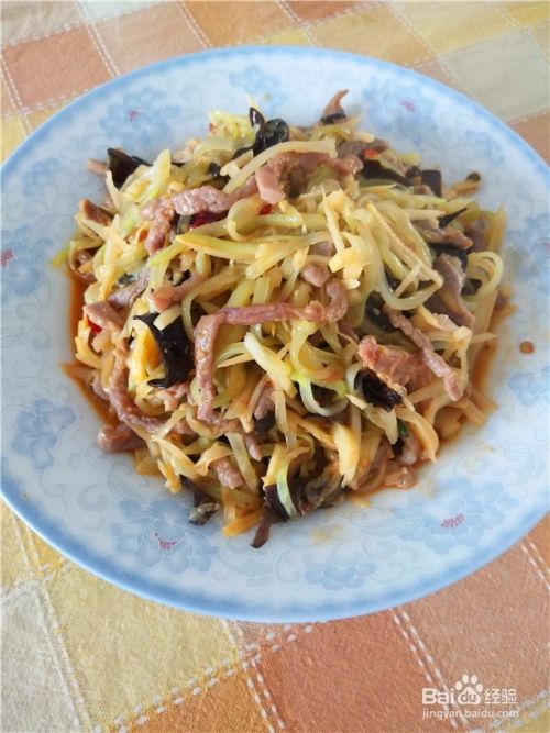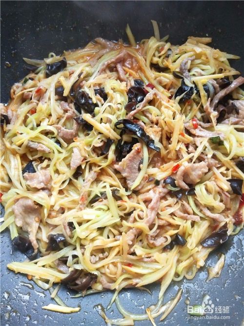 再倒入竹笋丝、木耳丝和莴笋丝,大火翻炒均匀即可出锅装盘。