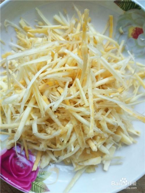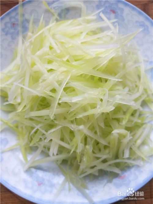把竹笋去掉外皮,切成细丝,在开水中焯5分钟,捞起来沥净水分备用。