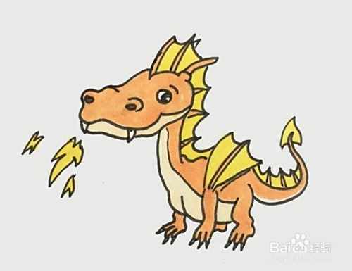最后涂上颜色,给身体涂上橙色,肚皮涂上淡黄色,翅膀和火焰涂上黄色,一条帅气的喷火龙就画好了。