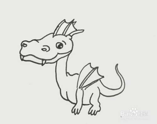 往下画出细长的脖子和带着翅膀的身体还有尾巴。画的时候注意上凸出的小细节,这样画出来的喷火龙更加的好看。