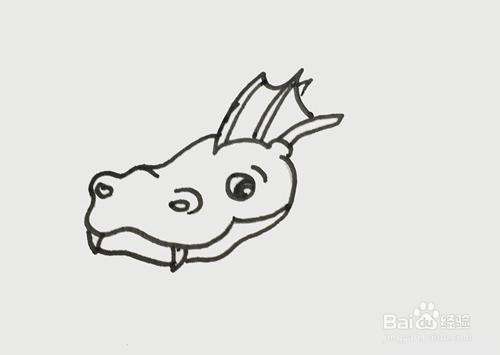 先画出喷火龙又长又扁的头部,在上面画出大嘴巴、小鼻孔、小眼睛和锋利的尖牙。