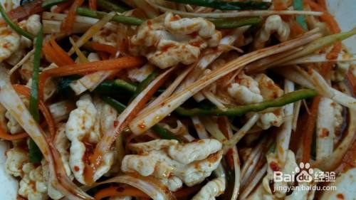 擦出适量胡萝卜丝;青椒适量,切丝;小葱取叶子。